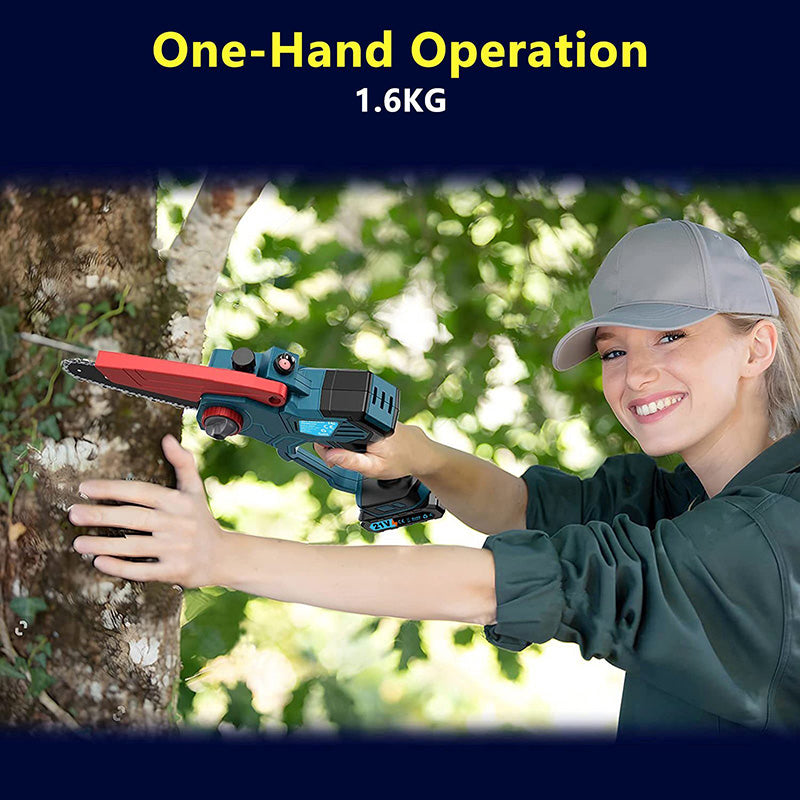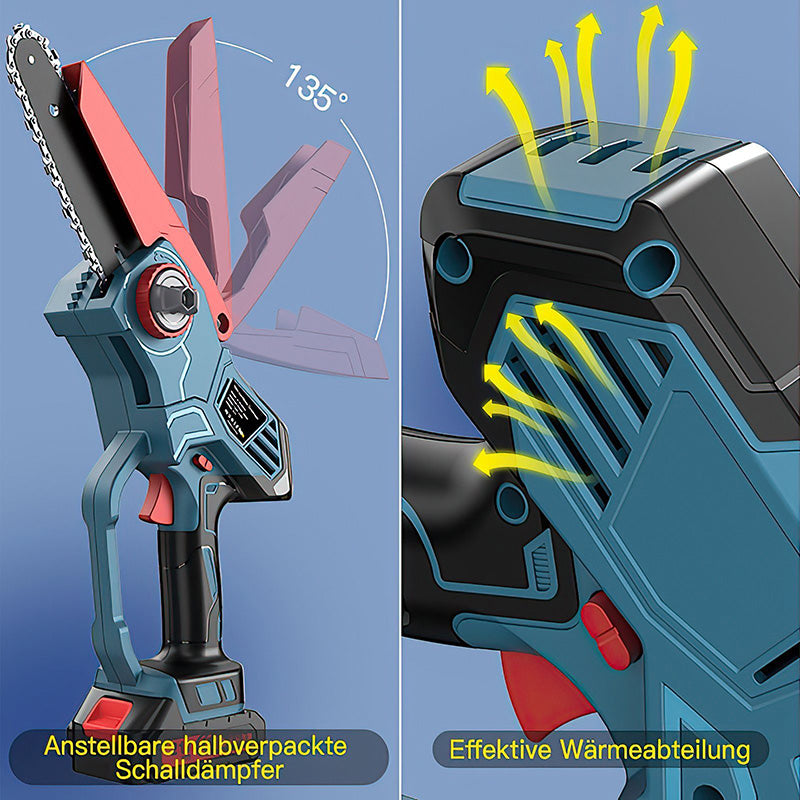 Mini Kettensäge mit Akku starker Leistung ist langlebiger.Schneideffizienz ist hoch,die Geschwindigkeit ist schnell,die Kette wird durch Luft- und Raumfahrttechnologie abgeschreckt,und das doppelseitige Klingendesign kann Holz mit einem Durchmesser von 10cm in 10S,ist nicht leicht zu brechen.Starke Abriebfestigkeit und Schlagfestigkeit.