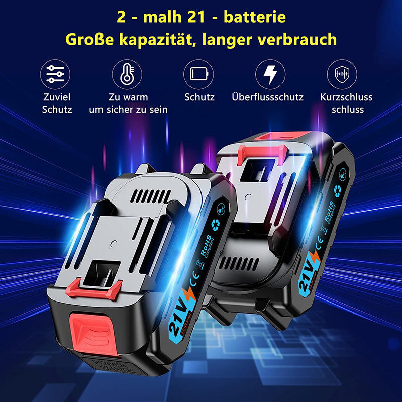 2 Hochleistungs Wiederaufladbare Batterie:Zwei 21V 2000mAh Batterien, ein Akku kann bis zu 50 Minuten laufen. Der Akku hat eine lange Akkulaufzeit und 2-3 Stunden Schnellladung.
